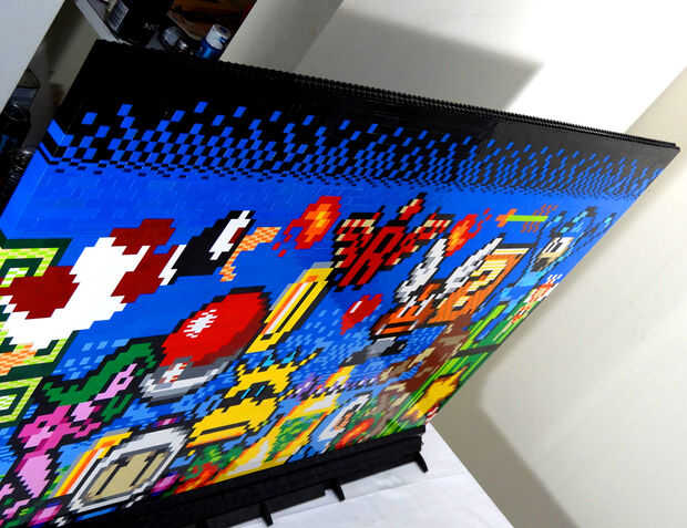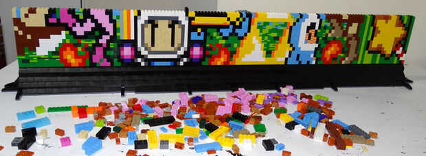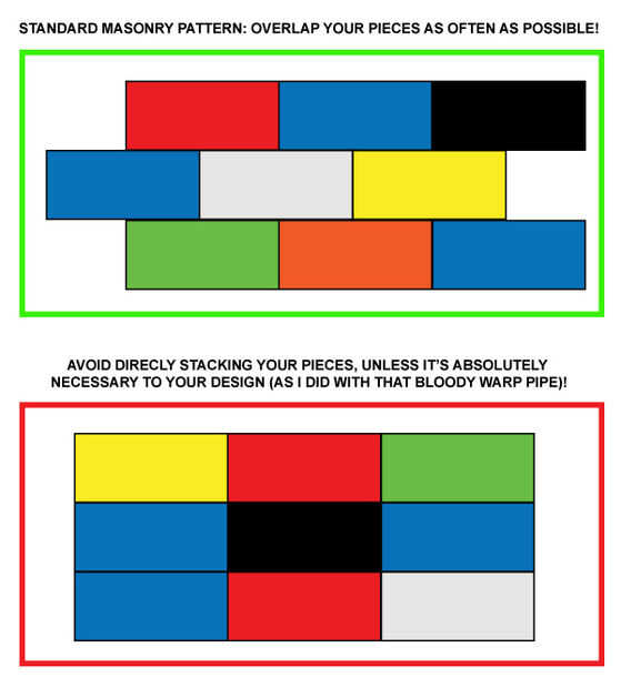 En su caso, asegúrese de utilizar un patrón resistente de la mampostería: en otras palabras, tratar de hacer tan a menudo como sea posible su capa superior de ladrillos se superponen sobre las grietas de la capa anterior. Se trata de una cuestión importante cuando estás haciendo cosas súper detallada con los pixeles individuales de 1 x 1--como se puede ver en la tubería de deformación extrema derecha. Como con el tubo de deformación, no tenía ninguna otra opción pero para no tener las piezas se superponen, por lo tanto, esa sección particular del mosaico completado es débil y tambaleante--a diferencia de la zona con Samus y Bomberman, que es bastante fuerte.