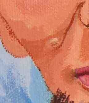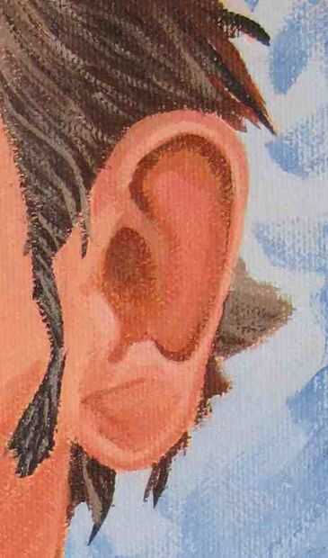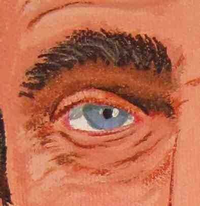 También podemos ver en fotografías que sus orejas eran grandes, cara demacrada, las tupidas cejas, pelo a veces desordenado, que tenía diferentes Estados de vello facial de vez en cuando, y que tenía un lunar en su mejilla derecha. He incluido todos los detalles en mi pintura, porque creo que comunican algo de la personalidad del hombre. Para el fondo, yo elegí un hash desordenado de la luz y mosh azul oscuros sobre una luz naranja, que coinciden con los colores de la piel y los ojos que escogió para él y mish desordenado de su pelo.