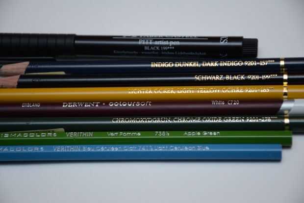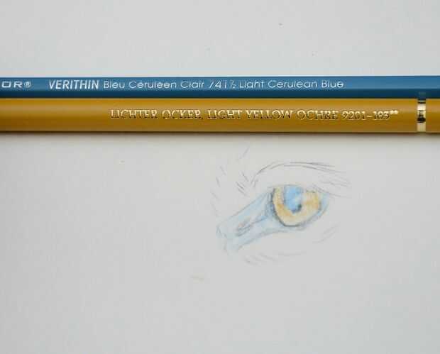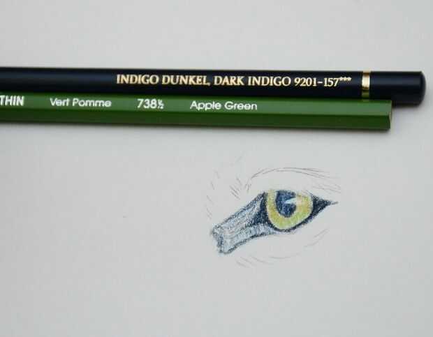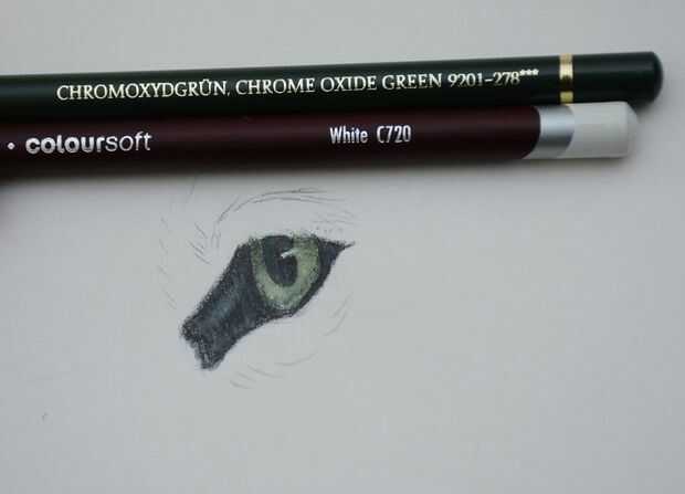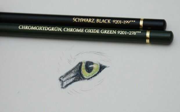Iniciar mediante el bloqueo de los negros con luz cerúleo (PV) y los verdes con luz amarillo ocre (FCP). Circulan por las zonas más oscuras con Dark Indigo (FCP) y superponer el iris con verde manzana (PV). Una ligera capa de negro Schwarz (FCP) a los negros y añadir detalles del iris con el verde de óxido de cromo (FCP). No se olvide la vena! Profundizar en los negros con la pluma de Pitt y otra capa de Schwarz Black. Añadir algunos detalles con blanco y el verde de tu elección y listo!