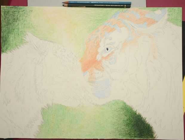Ir a este con un tono más oscuro de azul. He utilizado Indigo oscuro (FCP). Esta vez, película de la muñeca para hacer las rayas ver furry (recuerda ir en dirección a la piel de flujos y para mantener el lápiz afilado). Empezando a parecer muy oscuro, ¿EH? Ahora, salir de su lápiz de color negro (recomiendo usar un lápiz negro relativamente suave, como un Caran D'Ache negro; Utilicé un Faber-Castell Polychromos Schwartz negro) y oscurecer cuando sea necesario. Tratar de hacer los trazos más cortos posible transmitir el aspecto de pelaje corto.