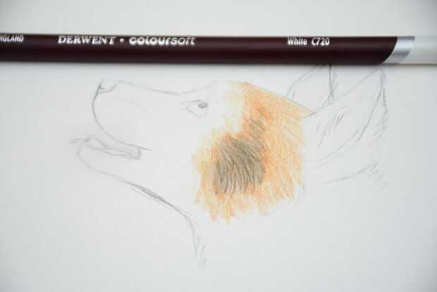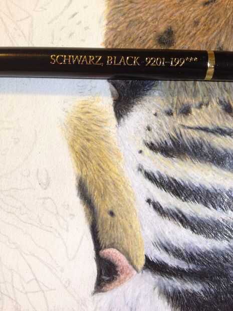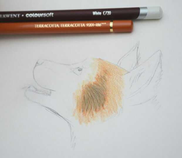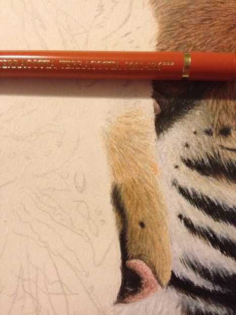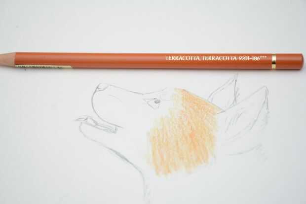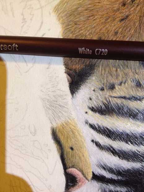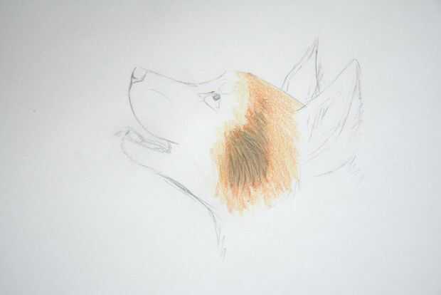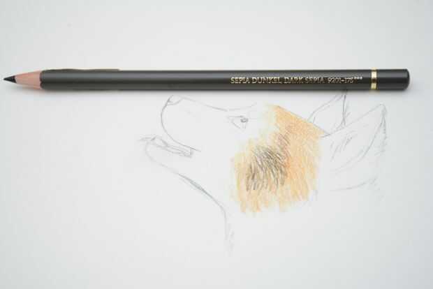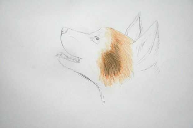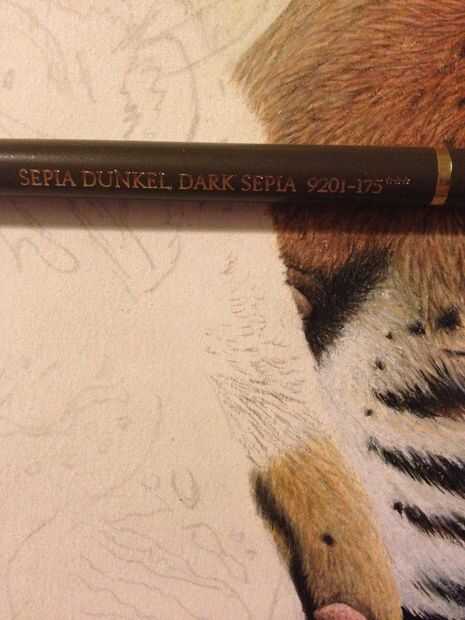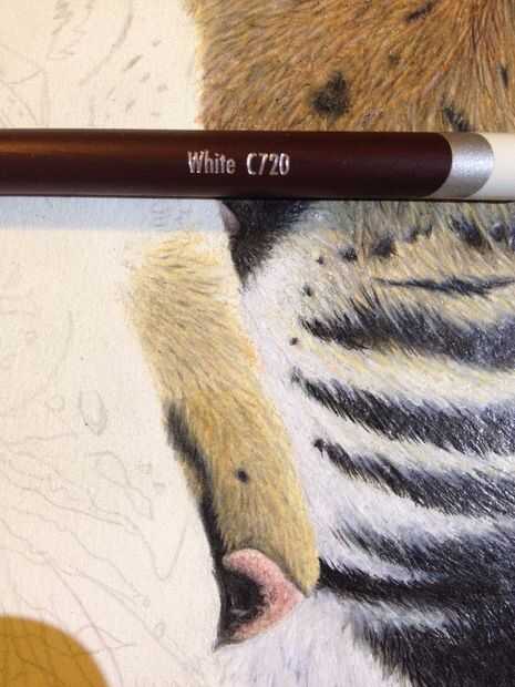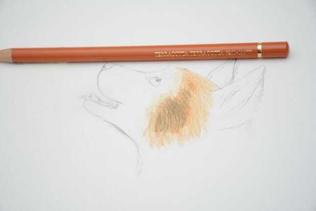 Usando lo que me gusta llamar el método spike, mechones de pelo con Sepia oscuro (FCP) del esquema. El método de punto es realmente divertido y muy fácil. Simplemente dibujar s pequeña, delgada, curvas "v" va en la dirección del pelaje. Pasar esto con blanco (CDL o CC o DD) y terracota (FCP). Básicamente, simplemente Repita el proceso, añadiendo detalles con Sepia oscuro, aclarar con blanco y tonificación con terracota.