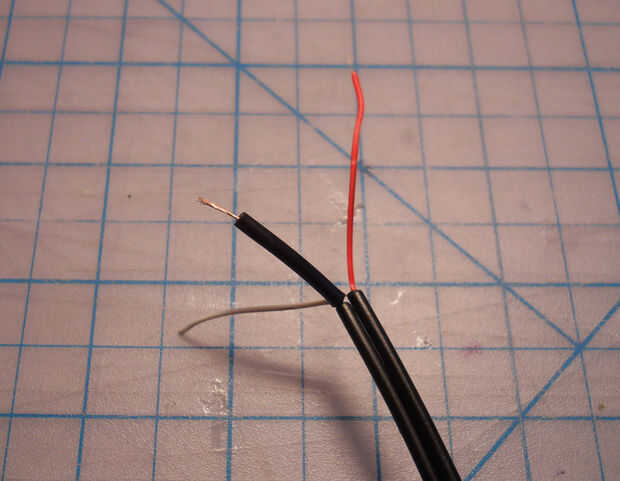 Desenrolle los cables de cobre de lo que fueron las clavijas rojas y blancas y envuélvalos juntos para crear un tercer alambre. Inserte un trozo pequeño de termo retráctil sobre este tercer cable nuevo.