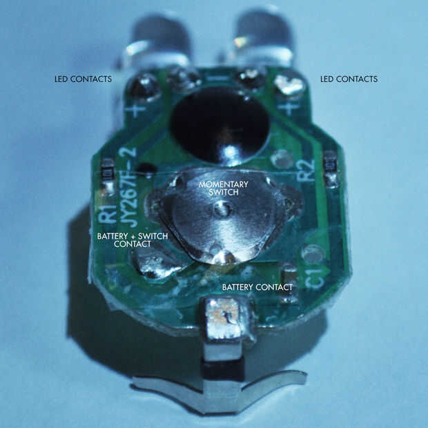 El interruptor momentáneo existente puede tener alguna cinta que la cubre, desea quitar la cinta y el pequeño pedazo de metal elástico que forma el interruptor momentáneo para que los terminales se pueden soldar a.