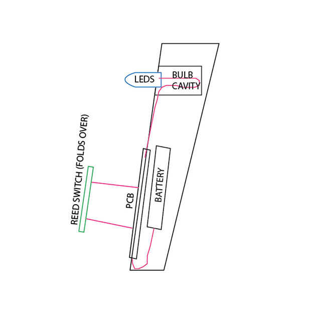 Se va a soldar los cables a la PCB para montar los componentes electrónicos a nuestra cubierta de luz. Tiene otro mirar la cubierta y tener una idea de más o menos la longitud de la misma, queremos añadir suficiente alambre para encajar la carcasa correctamente, consulte el diagrama adjunto (rosa = hilos). Preferiblemente la batería va a quedar al ras contra la parte trasera de la carcasa, el PCB se sienta sobre el y la caña interruptor en el lado o en cualquier lugar conveniente en el borde de la carcasa.
