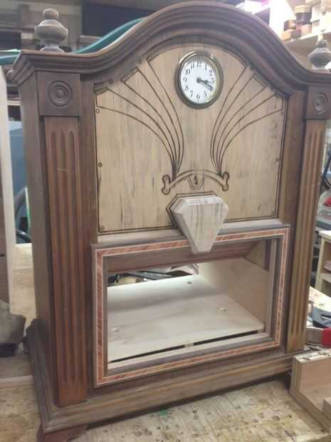 La pieza estaba necesitando algo,.. .mas de líneas vintage. Visto imágenes de las viejas radios podría, agarré mi set de curva francesa y dibujó algunas líneas. Una vez que estaba contento con que I woodburned ellos profundamente para que en pasos posteriores la madera mancha no cruzan las líneas. La diferencia puede parecer leve en las imágenes, pero se ve muy bien en persona.