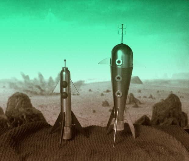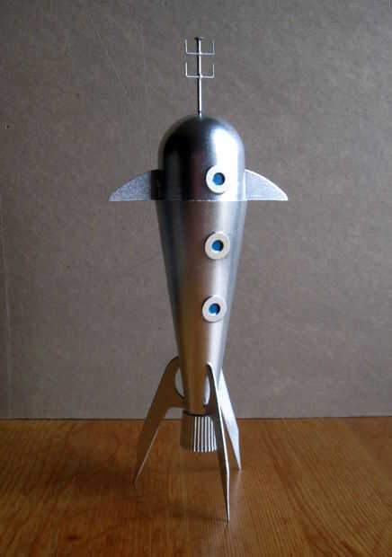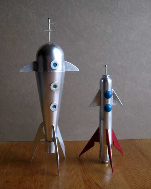 me encantan los cohetes de estilo Déco aerodinámicos de las viejas películas de sci fi, así que pensé que haría un par de las probabilidades y termina. Es fácil de hacer - solo busca algo en forma de cohete y añadir aletas y ojos de buey. Poco uno se hace de un marcador, la más grande de un molde de paletas y la tapa de un frasco de desodorante roll-on. Las aletas están hechas de los aplicadores de seda dental raro. Use lo que usted puede encontrar que se ve buena-arandelas, tapas, tubos de pasta de dientes, uñas, etc.. Tiendas de dólar son una gran fuente de piezas y pedacitos de plástico baratos.