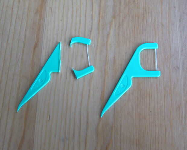 Aplicadores de seda Dental vienen en una variedad de formas y están hechos de plástico barato que es fácil de cortar con un cuchillo afilado. Lijar los bordes ásperos y pegar en el cuerpo donde ven bien.