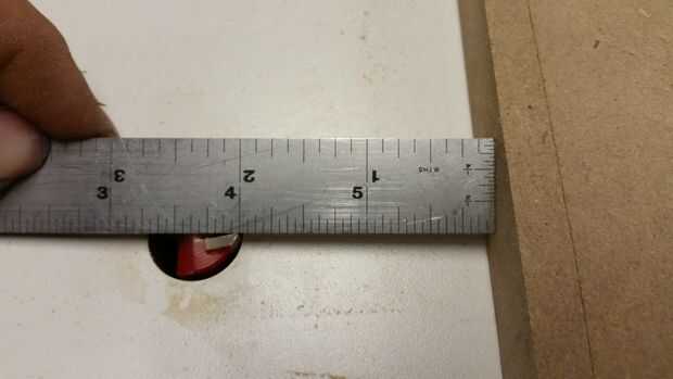 Así que primero lo primero: tiraron una recta de 3/4 corte poco en mi router. Entonces puse mi valla (una pieza de mdf recta, lisa) por lo que era 3 1/8" a los de fuera de mi granito de arena. Luego utilicé un trozo pequeño de 1/2" mdf como separador y doble comprobar que esta me da un espacio de 2" entre mi guía y el interior de mi broca. Esta configuración hace posible ejecutar la pieza dos veces para conseguir mi ranura de 1 1/8" sin tener que mover la valla. A continuación, tope la pieza contra la guía y la broca. En el extremo I medido hacia fuera 2 1/2" y enroscada de un bloque de tope. Esto asegura que dejar la pieza con precisión cada vez. Por último me puse a la altura de la broca a 3/16". Mi altura final será de 3/8" pero decidí hacerlo en dos pasadas.