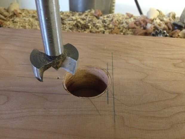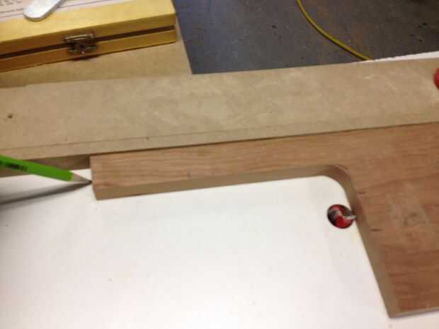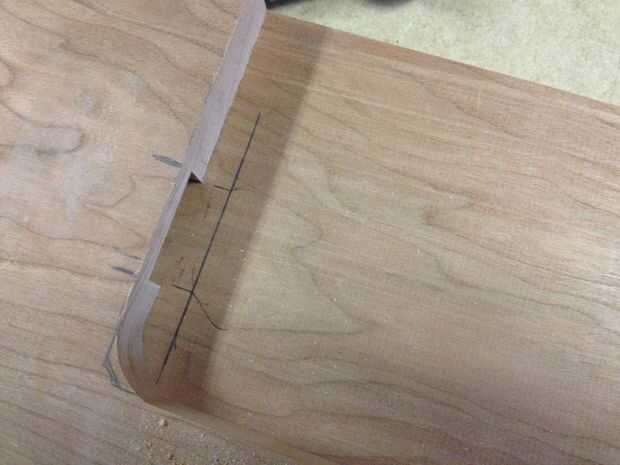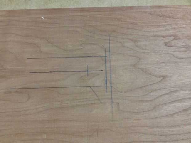 Junte las dos piezas y transcribir las líneas de la pieza de fina a la gruesa. Utilizando un desplazamiento T-square extender esas líneas. Luego dibujar uno en el centro exacto entre las dos líneas. Estaba usando un 1 1/4" forstner bit para el siguiente paso, así que dibujé línea 5/8" + 1/4" desde el borde. El 1/4" es para que el agujero se oculta algo cuando es todos junto.