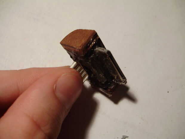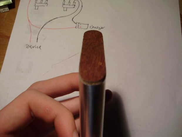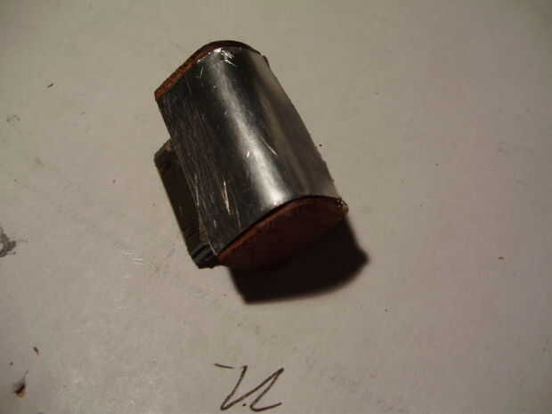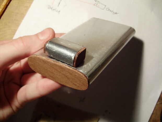 La diapositiva electrónicos internos en la carcasa de metal solamente de una sola dirección, como los interiores son más gruesas en la parte inferior que en la parte superior. Para fijar los tapones en su lugar, simplemente pegué en la parte superior, puesto que nunca se necesita extirpar. Para asegurar la parte inferior uno, añadí pestañas de pegamento, para extender artificialmente la profundidad de la PAC. Luego meter dos agujeros muy pequeños en los laterales de la carcasa de aluminio y atornillan tornillos muy pequeños a través de ellos y en las aletas de la cola. Así, si necesito quitar las tripas del cargador, puedo Desenroscar la tapa inferior y apenas resbale el interior hacia fuera.