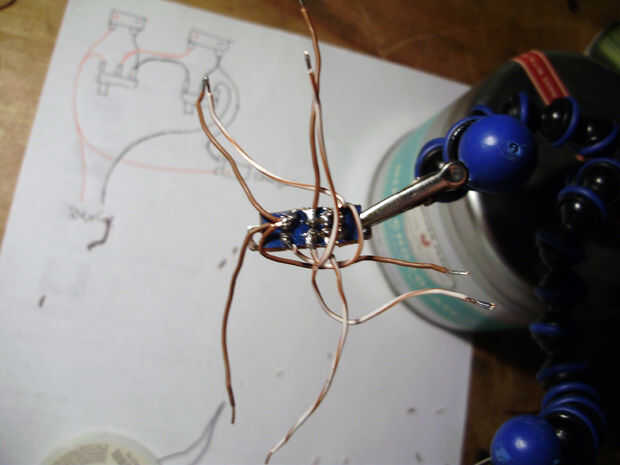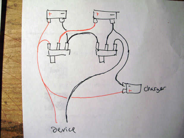 Edificio el cargador, el problema más grave de la electrónica me enfrenté fue que sólo tenía un cargador de iones de litio que podría cobrar 1 celda, pero para poder utilizar el regulador de tensión 7805, tuviera bien en 5V, lo que significa que tuve que usar las 2 células en una serie. Para evitar este problema, he diseñado un circuito utilizando un interruptor DPDT. Cuando el interruptor está volteado una dirección, las dos células están cableadas en paralelo y se conectan a un conector de barril para cargar. Cuando se gira el interruptor de la otra dirección, las células son conectadas en una serie y la salida al regulador de voltaje. Esto me deja cargar las celdas de 3.7V pero descarga en 7.4V.