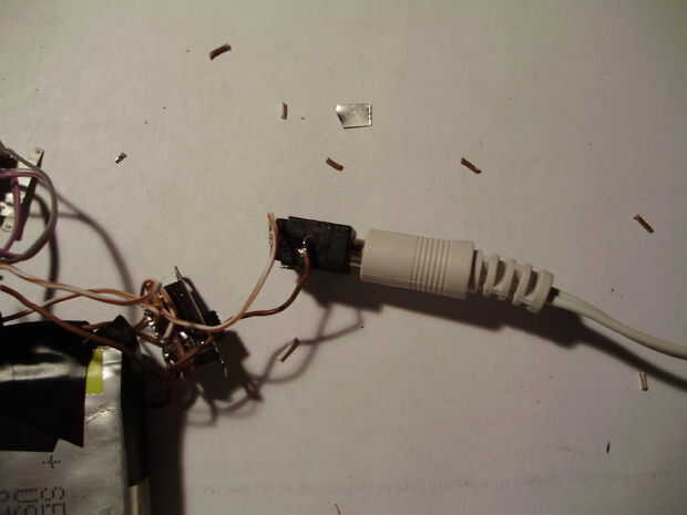 El cargador de Li-Ion solamente tenía disponible era un cargador de batería de la cámara, así que tuve que hacer algunas modificaciones a la misma por lo que podría cobrar este proyecto. Abrir el cargador y soldar dos cables conectados a un conector de barril para los terminales positivo y negativo dentro del cargador. Luego cortar un pequeño orificio en el plástico de la pared del cargador y enruta los cables nuevos de todo. Ahora, para cargar las baterías, simplemente mueva el interruptor a la posición "charge" y enchufe el conector de barril sale el cargador en el enchufe que he añadido en el paso anterior.