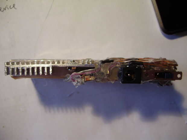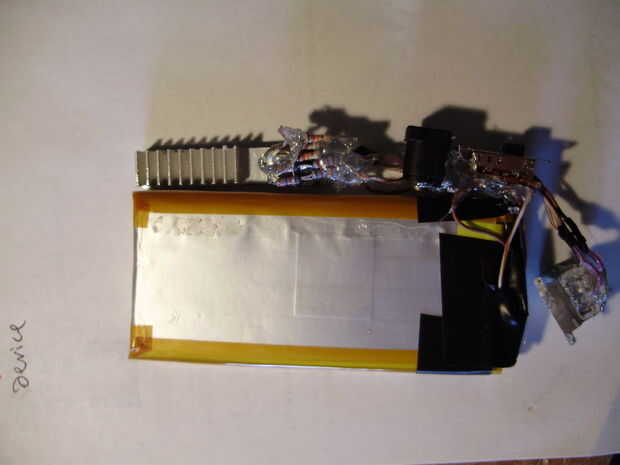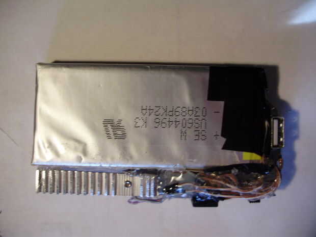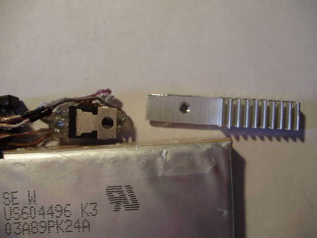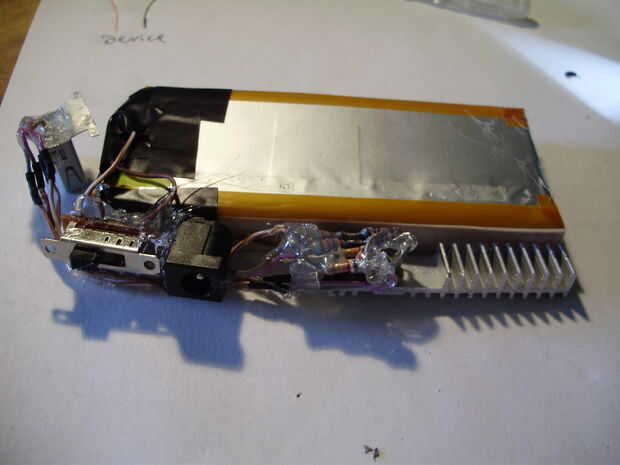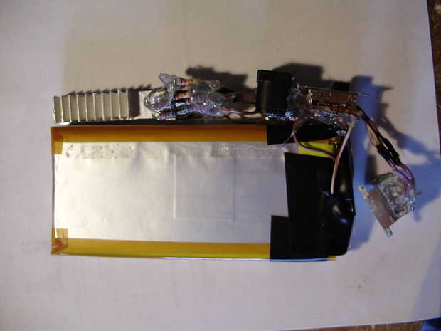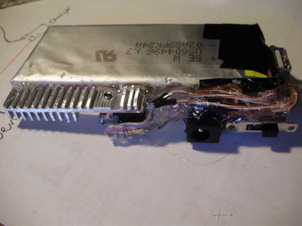decidí que sería más fácil construir un caso apuesto si el cargador tiene una estructura interna que mantiene juntos. Entonces el caso podría ser totalmente estético, en lugar de estructuralmente importante. Para asegurar todos los componentes, yo simplemente caliente pegado a las células de la batería, tan compacto como sea posible. La desventaja de usar un montón de pegamento caliente para unir todo, es que es casi imposible arreglar cualquier problema eléctrico que pueda surgir. Sin embargo, puesto que el circuito utilizado es muy simple, estoy esperando que nada irá mal cualquier momento pronto. Durante este paso, he añadido un disipador de calor al regulador de voltaje. Utilicé un segmento delgado de un disipador de calor extraído de una fuente de alimentación ATX muerta y cortado y presentado para que quepa dentro de las dimensiones del cargador. Ya tenía un agujero roscado, por lo que simplemente lo atornillan en el 7805 con un poco de pasta térmica entre los dos. Antes de pegar todo junto, no se olvide de probar el circuito para ver que nada ha ido mal. No quiere tener que arreglar una vez todos los componentes están cubiertos de pegamento.