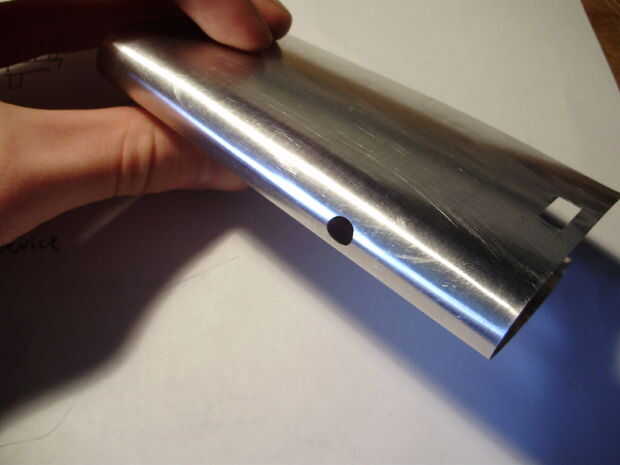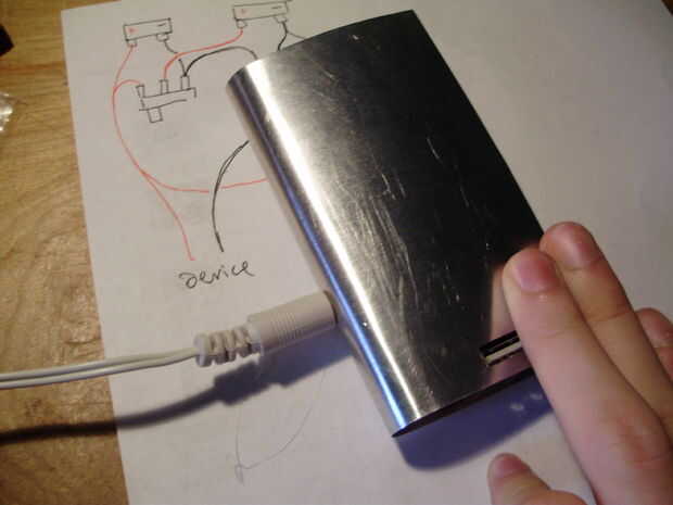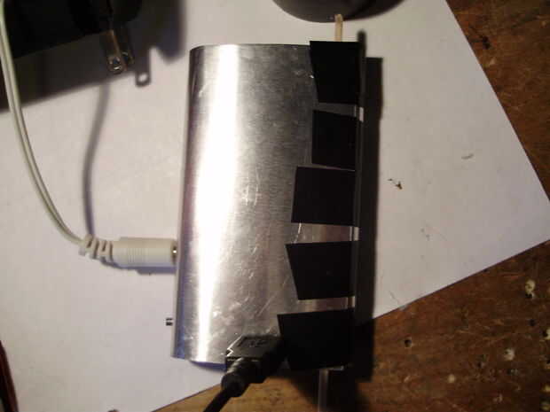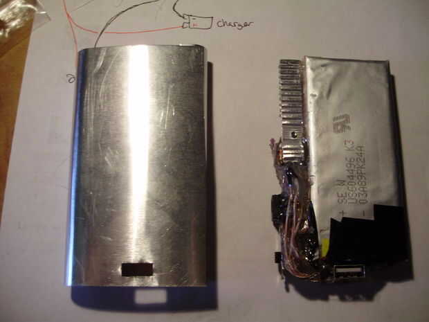 Cuando el aluminio satisfactoriamente fue cortado, colocar la electrónica interior de aluminio y conectado un cable USB al puerto USB y el cargador en el puerto de carga, para mantener el recinto correctamente alineado sobre la electrónica. Luego había pegado a la costura en el metal con epoxy y envuelve la Asamblea en cinta aislante para unir la costura mientras el pegamento seca.