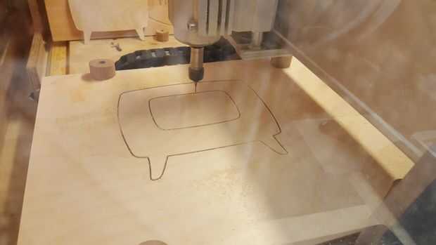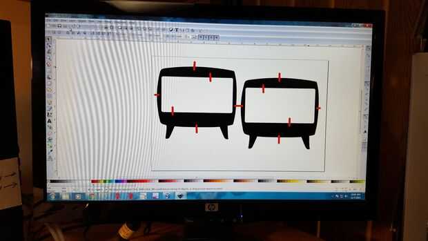 El diseño fue hecho en Inkscape después de cortar con tijeras una captura de pantalla de una forma de tv. La imagen fue ajustada alrededor un poco y guarda como un archivo SVG. El archivo se abrió en un programa (gratuito) llamado Jscut (jscut.org) para definir las trayectorias de herramienta para CNC pequeño.