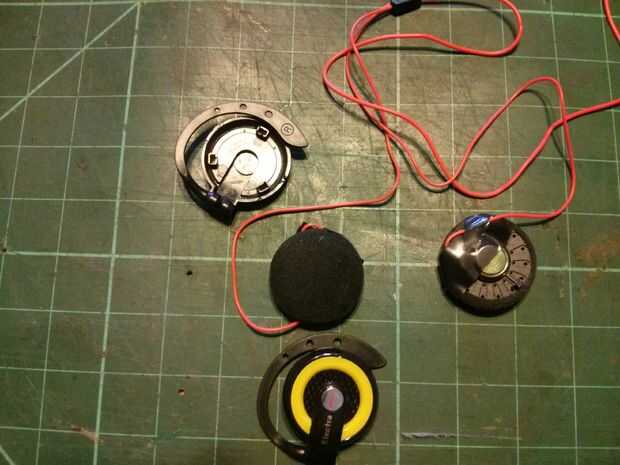 El reciclamiento de los auriculares deben desmontarse así. Un punto importante es tener mucho cuidado con los cables en este punto. Esta es una lección que aprendí en mi primer intento cuando inadvertidamente les daña, pero todavía, era solamente $2 perdidos. La forma más fácil de separarlos fue Inserte un destornillador plano entre la carcasa y el altavoz y darle un giro suave. Estos modelos más baratos deben pop aparte fácilmente. Te recomiendo poner un trozo de cinta aislante en la parte posterior del altavoz, donde los cables se conectan para sostenerlas mientras trabajas, por lo que no rompen accidentalmente durante el montaje.