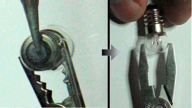 El método seguro para quitar la bombilla vieja, consisten en la bombilla en un trozo de papel de embalaje y agrietarse con los alicates.