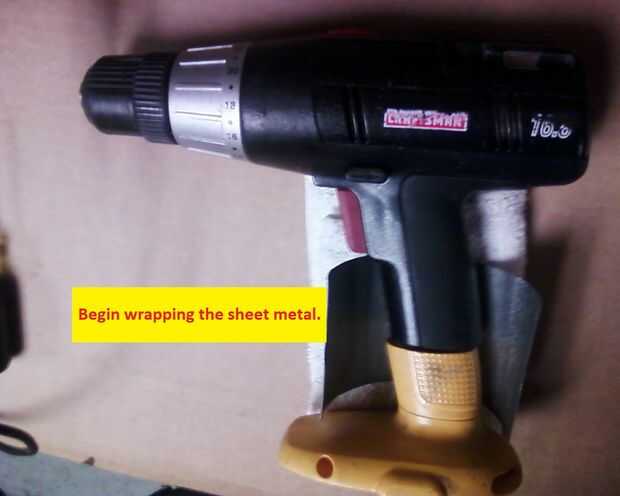 Abra las mordazas de tornillo de banco de 1/8 ". Utilice el borde superior de la mordaza a la forma o la chapa del rodillo en un semicírculo. (La manija en dispositivos inalámbricos es 6" en la circunferencia, por lo tanto el metal de hoja es 6-1/2' largo para una buena superposición cuando completa.) * Utilizar guantes de cuero para proteger las manos.