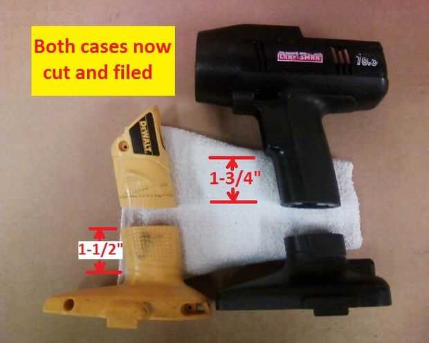 Comenzar con el antiguo caso de taladro. Envolver un paño alrededor del cuerpo del caso para proteger de rasguños y deslizarse, luego fijarlo con la abrazadera entre las mordazas del tornillo de banco en línea, utilice la sierra para cortar la caja en dos piezas. Repita el procedimiento anterior con el mango de pilas de linterna. * Use gafas de seguridad para proteger los ojos.