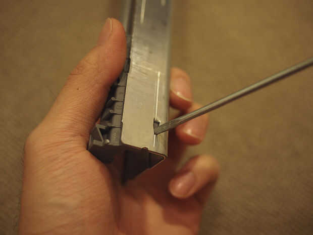 Manteniendo el dedo allí, voltee el riel y use el destornillador para soltar la ficha plástica el extremo pequeño del resorte del mecanismo empujando hacia abajo con el dedo (es decir, hacia el final de la baranda) y usted puede entonces lo despega la ficha metal suavemente sea descansar contra el extremo del resorte del mecanismo de la liberación.