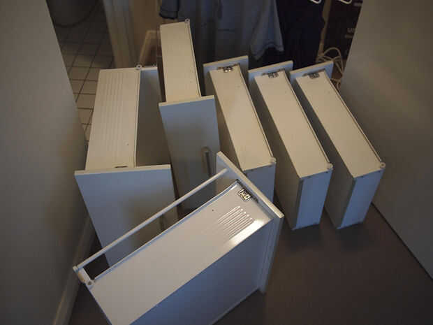 Prefiero los pernos como oculta posible, así he instalado minas en el extremo de la cocina. Tenga en cuenta que los cuadros segundo y terceros en este paso son de cajones en lados opuestos de mi cocina.