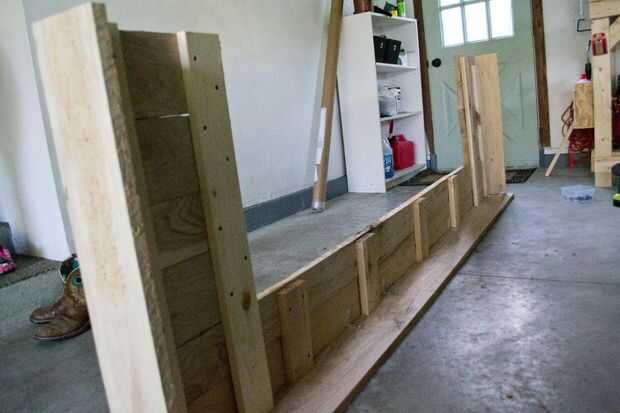 Después de instalar todas las mejores tablas en la estructura original de 3 piezas, añadí 2x4s en la parte inferior para añadir un poco más carne a la pieza y para un apoyo extra. Otra vez, esta pieza fue colocada sobre un manto de hormigón existente, tan largo como las tablas me alojé juntos e incluso, que la estructura era sonida.