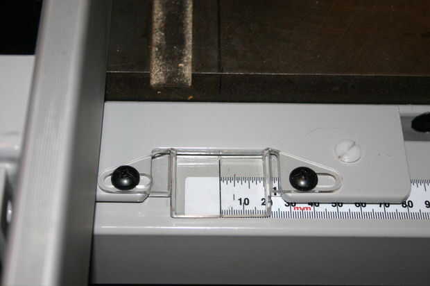 Ahora seguir adelante y pop la valla en la parte delantera carril/guía de tubo. Línea de la vista en la guía con la línea de cero en el tubo guía y bloqueo hacia abajo. ¿Levante la hoja hasta la altura completa... Desenchufe la sierra, justo? Por supuesto lo hizo. Coloque la cerca sobre la mesa y deslice firmemente contra la hoja de sierra. También asegúrese de que el riel frontal quede firmemente contra el frente de la sierra. Utilice unas pinzas para asegurarse de que el tren delantero es bastante nivel y que todo está seguro.