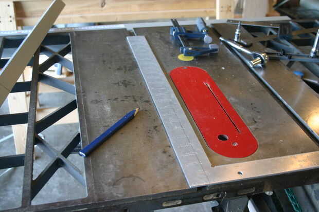 Ahora transferir la marca del lápiz desde el riel delantero al frente de su mesa de la sierra. Retire el riel de guía y la parte delantera y apartarlas. Ahora, con una pequeña plaza, ampliar ese lápiz Marque el frente de la tabla. Usando un cuadrado más grande, extender la marca del lápiz todo el camino en la parte superior de la tabla y luego por la parte trasera de la tabla. Ahora tenemos todas las guías que tenemos que alinear correctamente la escala.