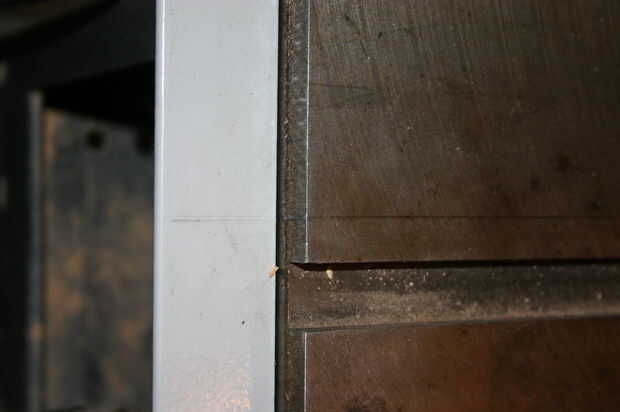 Seguir adelante y conecte el tubo de guía a la barandilla delantera. Con su escuadra contra el borde del tubo guía, busque la línea "Cero" y transferir un lápiz marque al riel frontal. Ahora, el riel posterior hasta el riel frontal a tope y transferencia de la marca. Apartar del riel trasero.