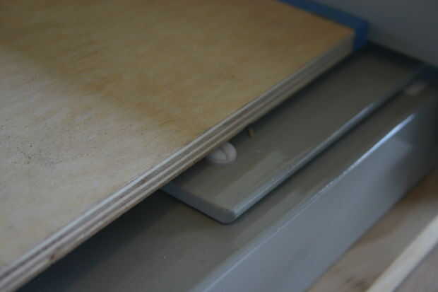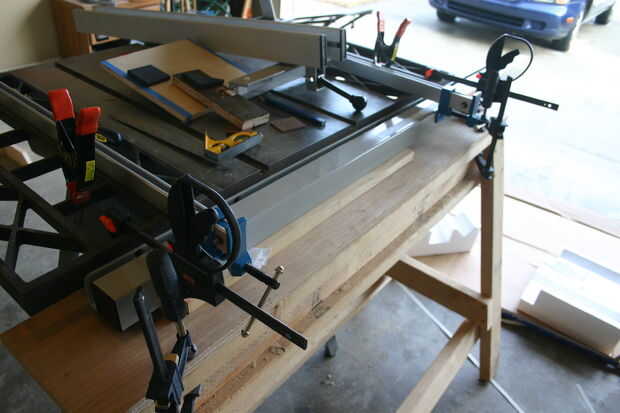En primer lugar, tenemos que conseguir el tubo de guía/carril frontal en posición. Sólo había apuntalado el montaje del carril del conjunto frente a un caballete de aserrar y deslizarse hasta la parte delantera de la mesa de la sierra. Alinearon la línea que dibujó en el riel frontal con la línea que marcó en la mesa. Entonces solía una combinación de madera y papel calza hasta donde yo quería. De vez en cuando el riel frontal en lugar de la abrazadera y pop la valla en busque espacio libre sobre la mesa.