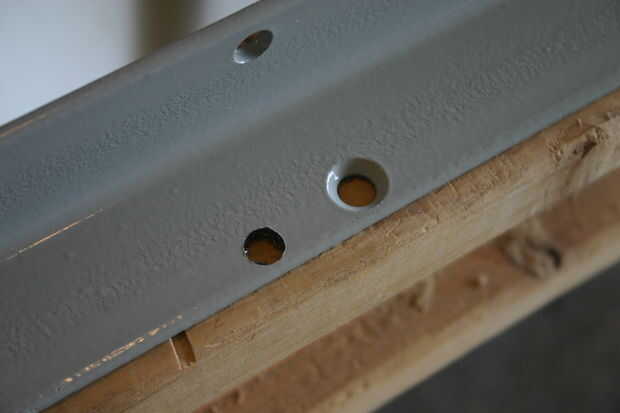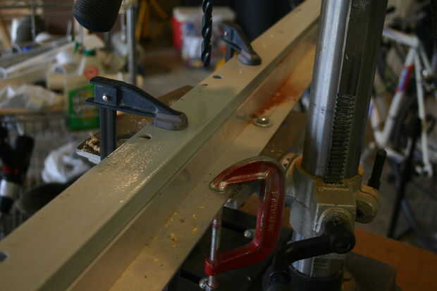 Usé una 7/16 broca para los orificios. Sus aproximadamente el mismo tamaño que los orificios en el riel y nos da una pequeña sala de wiggle para puesta a punto más adelante. Cuando taladre los orificios, asegúrese de que una lata de WD-40 útil para enfriar las cosas. Además, asegúrese de que usted tiene sus gafas de seguridad en como vas arrojando alrededor de un montón de virutas de metal. Después de perfora el primer agujero, sólo Deslice el riel y taladre el segundo agujero.