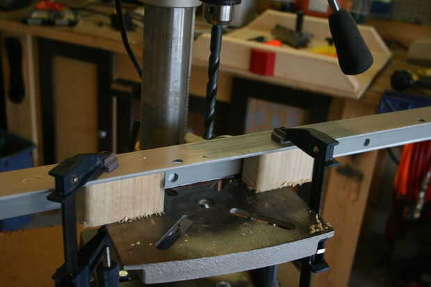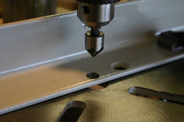 A continuación, instale un broca en el taladro de 5/8" avellanado. Avellane los agujeros hasta que la cabeza del tornillo sentarse a ras. Se realiza el riel frontal, sólo Monte la guía de tubo a ella y emperne la sierra y asegúrese de que todo alinea como debería.