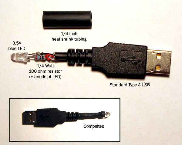 Imagen es auto bastante explicativos, solo soldar el LED cerca del conector USB como sea posible con la resistencia en la pierna del ánodo (+) del LED. Deslice sobre la tubería encogible, calor hasta que se doren y difundir la punta del LED con un papel de lija o un nailfile desechable. Éstos trabajan muy bien detrás de mi escritorio, laptop, Xbox 360, caja de cable y dvr.