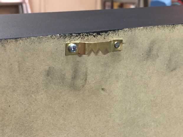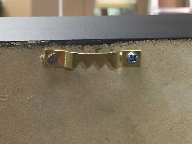 Último paso a una pieza terminada es para agregar el hardware de montaje. Usé estos colgadores de diente de sierra típica. Eran bastante endebles, y al final que perforó hacia fuera y utilizan tornillos más grandes para garantizar a la parte trasera y el marco. Probablemente se dará cuenta de las fotos que tengo un clavo y un tornillo en cada uno de ellos (otro error). Esto es una lección importante perforar agujeros y usar hardware de alta calidad (ya rompí 2 cabezas de los tornillos durante la instalación). No quiero hacer cosas sucias usé sólo algunos clavos a fin de proteger el hardware.