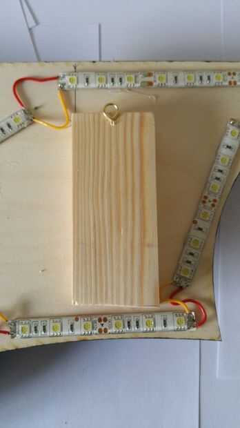 A continuación, utiliza pegamento caliente para fijar 2 bloques de madera (45 x 15 mm) con un pequeño anillo (no estoy seguro del término correcto) y les colocado igualmente a cada lado de la espalda así que tenía un buen lugar para colgar y también daría cierta profundidad al reloj que permitiría que la luz que irradian hacia fuera con eficacia.