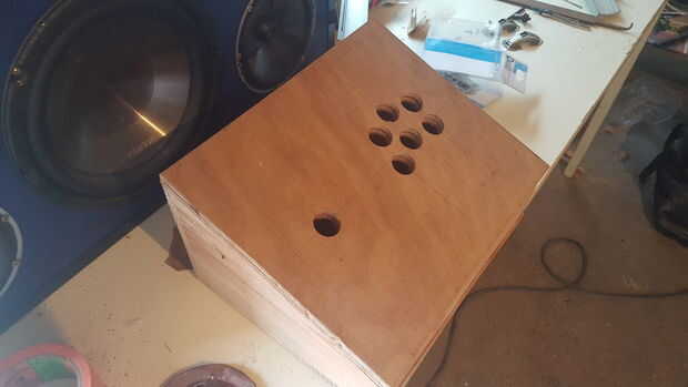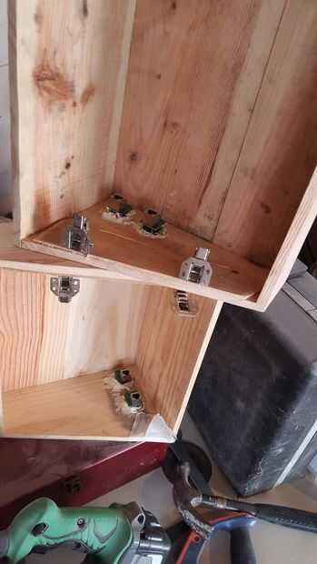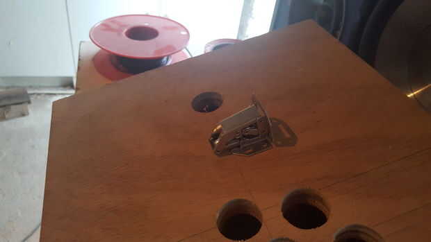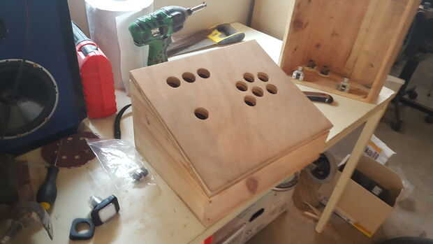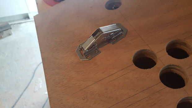 Usé un lienzo para el diseño de botones. Usted puede encontrar aquí: Sanwa diseño entonces, tuve que atornillar la placa a la caja. Aquí, me encontré con un problema. Las bisagras que compré tienen un ángulo de 90 grados cuando está cerrado, así que no pude colocarlos en la parte posterior de la caja, ya que hay un más importante ángulo de 90 grados. Simplemente coloqué las bisagras en el lado de la caja.
