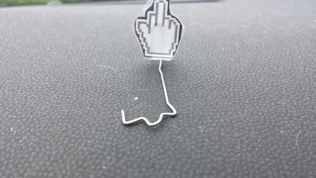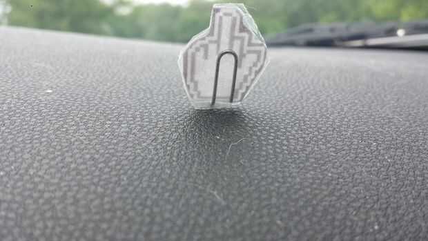 encontrar una pieza adecuada y bien contrastada de clip-art, reduzca el tamaño hasta que se imprime sobre el tamaño de una moneda de diez centavos. laminar la pieza impresa con alguna cinta, enderece un clip, attatch la foto laminada a un extremo del clip y doblar la punta en el ángulo adecuado para sentarse en la vista de una cámara en cualquier coche.