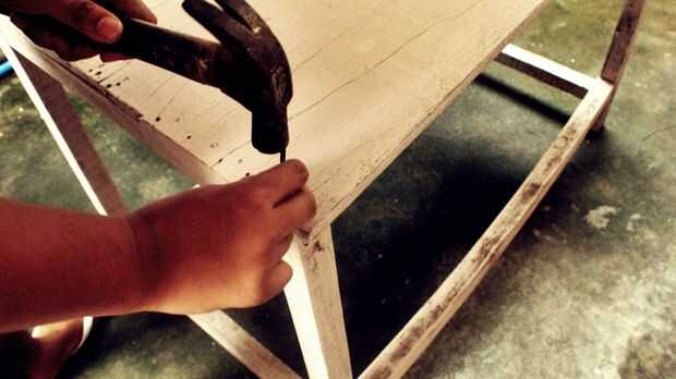 herramientas:RompecabezasLijadoraTaladro del impactoTornillos y clavosMaterial:Encontré una balsa, parquet madera, cajones y alguna basura que utilicé para las piernas* por favor, use equipo de protección cuando se utiliza equipo pesado* Recuerde: mi