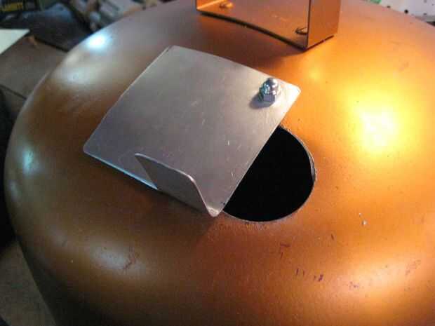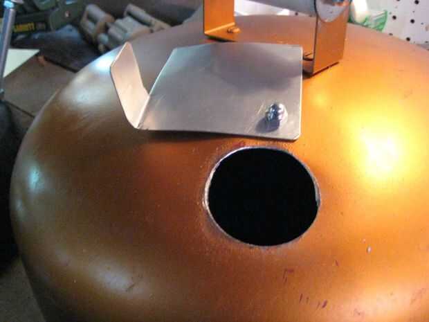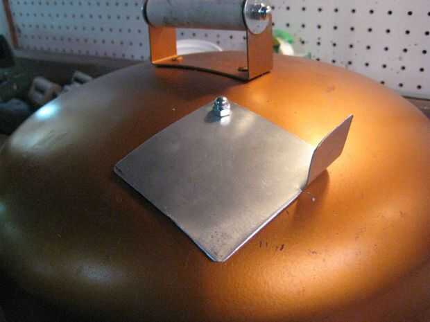 Corté las tapas de ventilación de aluminio ga 18 con mis tijeras. Salí de una aleta de metal en mi corte a la curva hacia arriba como el mango. También doblé los bordes con una esmeriladora de banco y lima redonda 1/2, y lijar el metal en una sola dirección para añadir un acabado agradable. Aseguró con un pequeño perno de SS y una tuerca de sobra a bastante para arriba. Tuvo que doblar las tapas un poco para acomodar la cúpula redondeada.