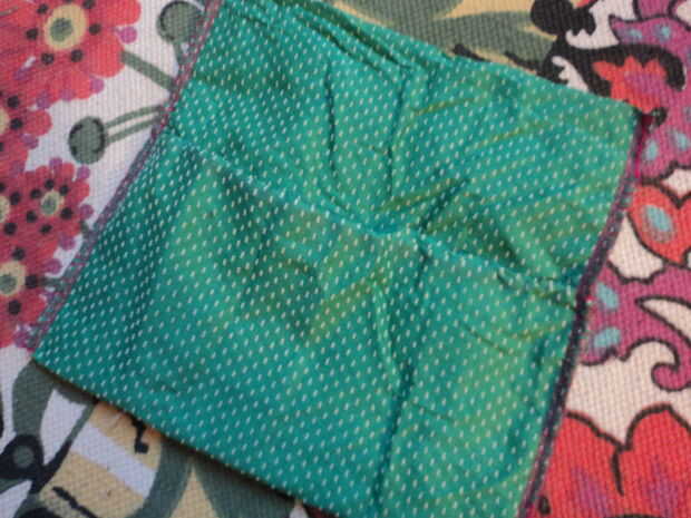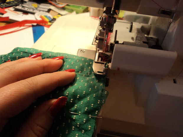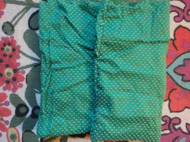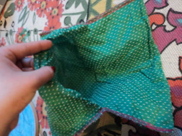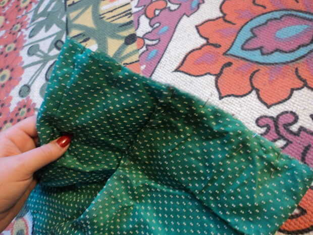 Con paseos en lados de la tela, doblan a la tela sobre para que se superpongan en el medio, como si se envuelve con papel normal. Asegúrese de que usted puede deslizar su regalo entre la abertura donde se superponen los dos lados de la tela. Prender a la tela juntos en los lados y coserlas juntas. Girar a la derecha de la tela hacia fuera a través del orificio que se forma donde se superpone la tela para que las costuras se encuentran dentro.