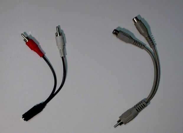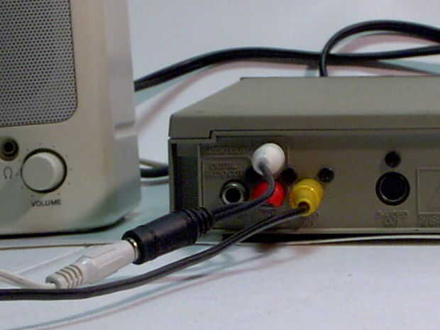 Un barato Y-cable con conectores RCA blancos y rojos en un lado y un enchufe estéreo de 3,5 mm hembra en el otro extremo es todo lo que necesitas para conectar más altavoces para ordenador a su VCR DVD o Blu-Ray player o estéreo.