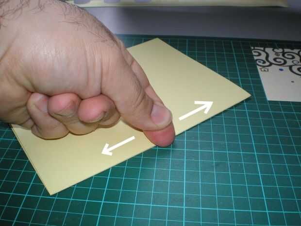 Para mejor resultado, antes de doblar, marcar la línea con la herramienta de corte (con el lado opuesto del filo, por supuesto). Luego, hacer presión con la uña moviendo a lo largo del pliegue.
