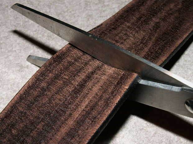 Cortar la correa de derecho a través con una tijeras o una cuchilla (tijeras probablemente dará una línea recta pero un cuchillo da un corte más limpio).