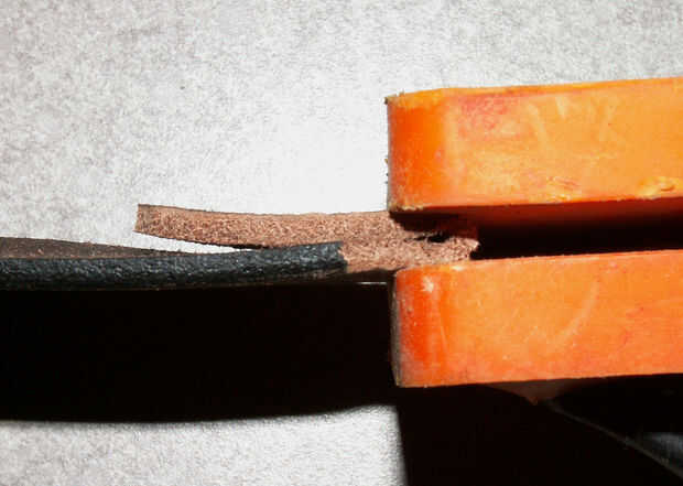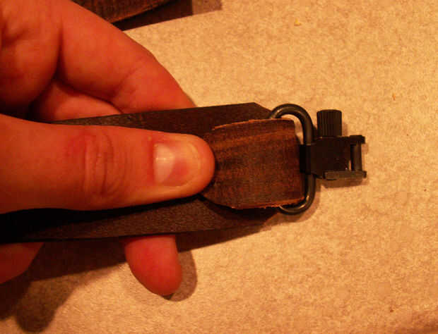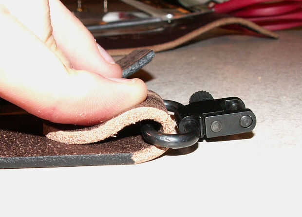 Para hacer el extremo doblado se sientan mejor cuando la eslinga todo finalmente va junto, use la mano a la abrazadera del extremo recortado contra sí mismo. Esto le da una "memoria" de ser doblado sobre el cuero y se quedará más plana. También puede golpear hacia abajo con un martillo o sujetar en un tornillo de banco.