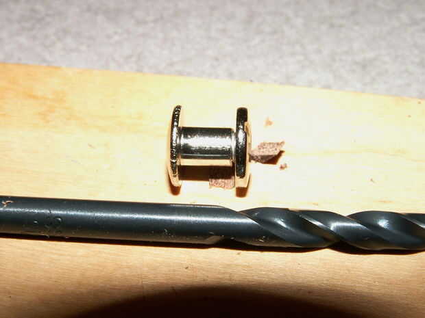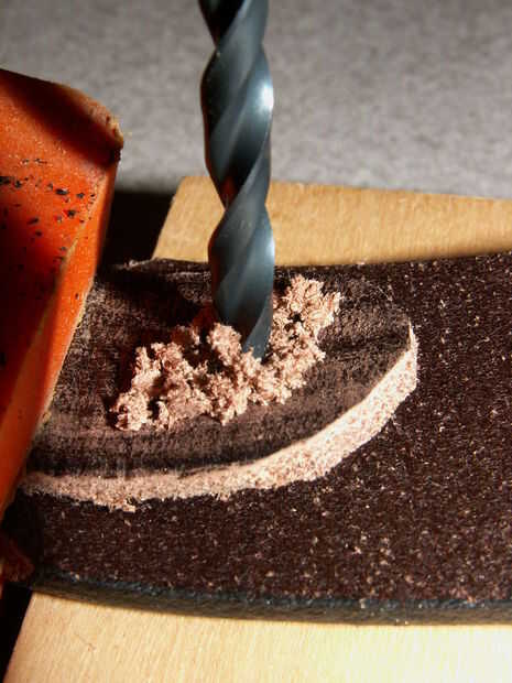 Colocar el doblado sobre la parte sobre el bloque de madera, utilice el taladro para perforar el agujero que alojará más tarde el tornillo de Chicago. Al perforar la piel, deje que el taladro a velocidad completa antes de presionar a través de la piel - hará un agujero más limpio. Probablemente deberás ampliar el agujero un poco por que gira la broca de corona alrededor del orificio.
