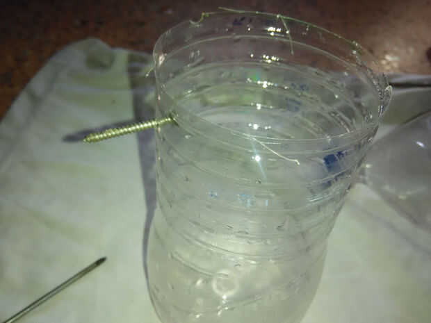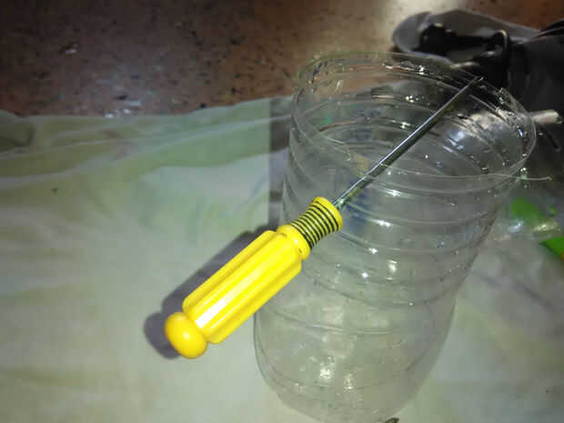 Ahora con la ayuda del destornillador hacer un agujero en la parte superior de la botella para colgarlo a la pared usando tornillos. Mantener 2-3cm de distancia desde la parte superior y hacer el agujero.