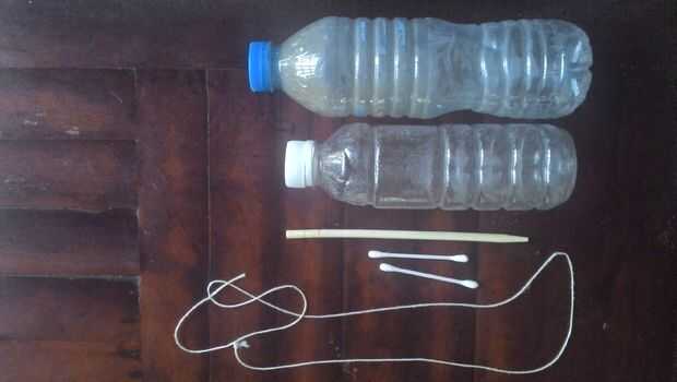 Mi suegro descubrió una manera de reutilizar botellas o para riego por goteo. Esto es cómo. Los materiales son botellas vacías, palillo de bambú, hisopo de algodón (bastoncillos de algodón) y cadena. Las herramientas son de tijera, pinza, clavo, cuchillo y pistola de pegamento caliente.