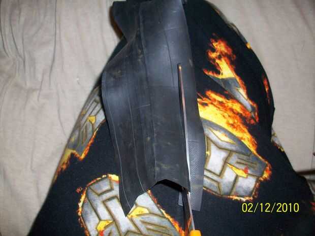Esta parte es donde tienes que hacer un poco echando un vistazo y conjeturar. corté mi tira sobre una media pulgada de ancho, y esta anchura funciona bastante bien, ya que estará cortando la tira por la mitad otra vez en el paso siguiente. Tubos interiores de la suerte tienen líneas en ellos, así que si usted corta cerca de una línea, se puede seguir y su encaje doble ancho quedará más o menos el mismo ancho.