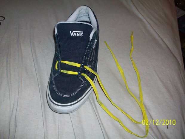 Para este paso, tienes que contar cuántos pares de agujeros tiene. Si usted tiene un número par, hacer este paso en el interior, pero si usted tiene un número impar, hacerlo en el exterior. Dependiendo de su número de agujeros, tomar los correspondientes encajes ponerlo a través del orificio directamente encima de él y luego páselo por el orificio correspondientes en el otro lado.