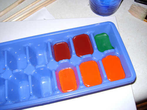 Si tengo poco de color extra después de terminar los moldes bonitos, pongo la bandeja del cubo de hielo. Yo uso de esos con mis hijos para hacer calcos de textura o guardo para nuestros próximo derretir y verter.